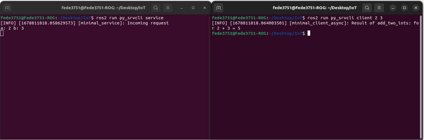 And then make a request to it with the client node:ros2 run py_srvcli client 2 3