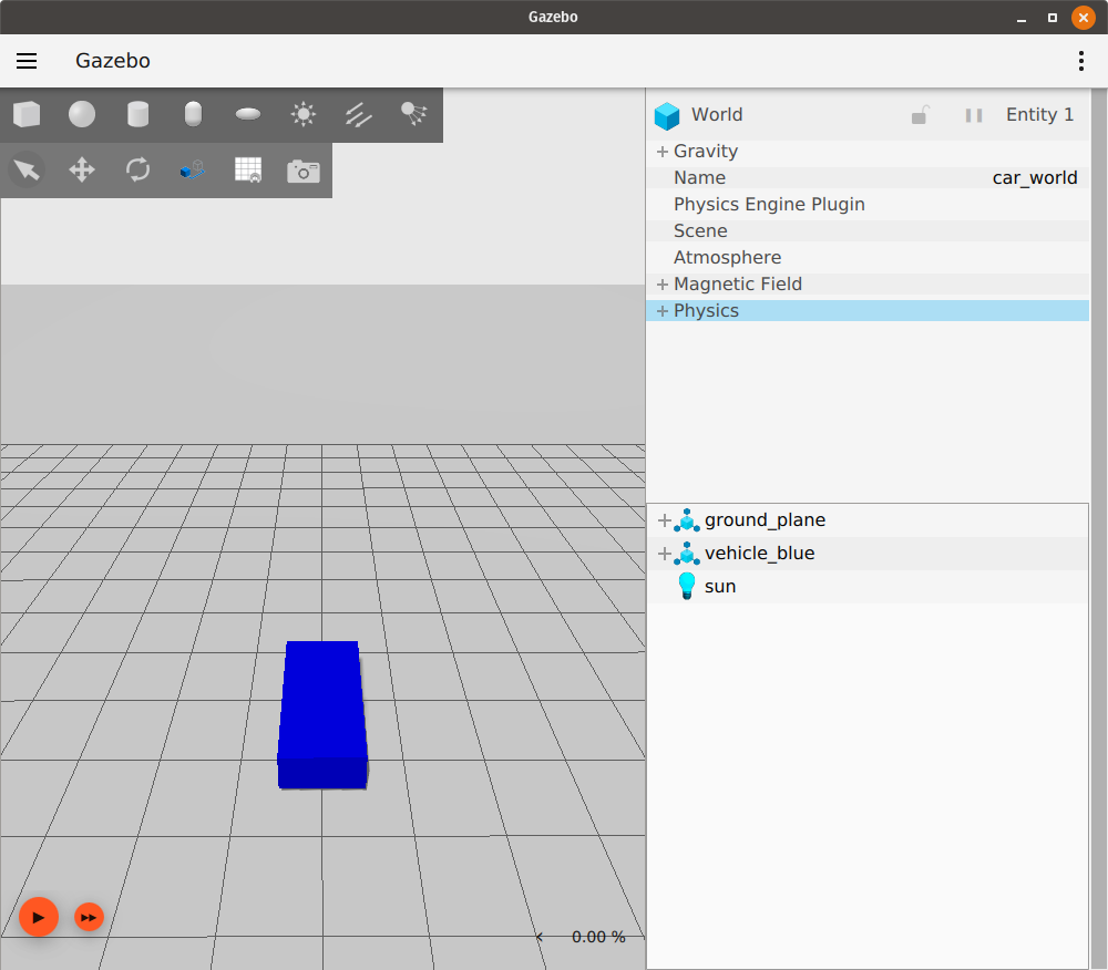 This will create an empty world, which we will use to get more confident with the environment of Gazebo.If you want instead to just have fun with Gazebo and learn by trial and error, just type