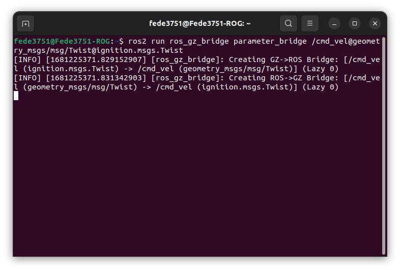 ros2 run ros_gz_bridge parameter_bridge /cmd_vel@geometry_msgs/msg/Twist@ignition.msgs.Twist